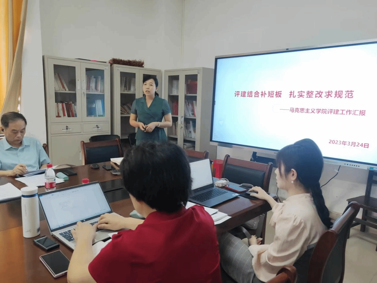 太阳成集团122ccvip院长戴彩虹对照本科教学合格评估体系20个二级指标39个观测点的要求以及新时期马院及思政课建设标准等,逐个观测点展开汇报,找寻差距与不足并提出下一步改进措施。