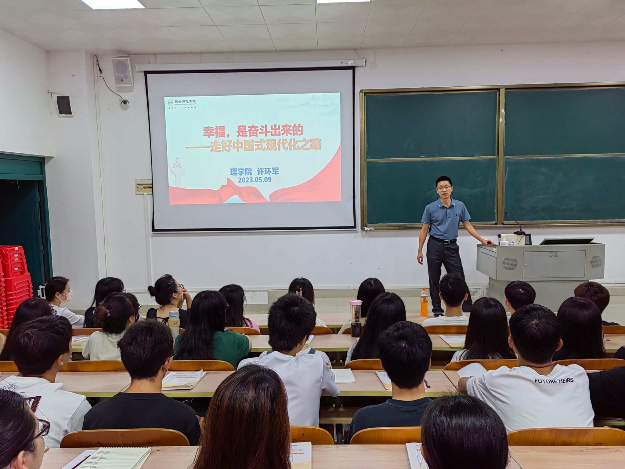为深入开展学习贯彻习近平新时代中国特色社会主义思想主题教育,用党的创新理论统一思想、统一意志、统一行动,把习近平新时代中国特色社会主义思想转化为坚定理想,依照太阳成集团122ccvip“思想政治理论课教学质量提升年”统一部署,形势与政策课教研部邀请理学院许环军副院长于5月9日为2022级数应1、2班做了主题为“幸福,是奋斗出来的——走好中国式现代化之路”的专题报告会。