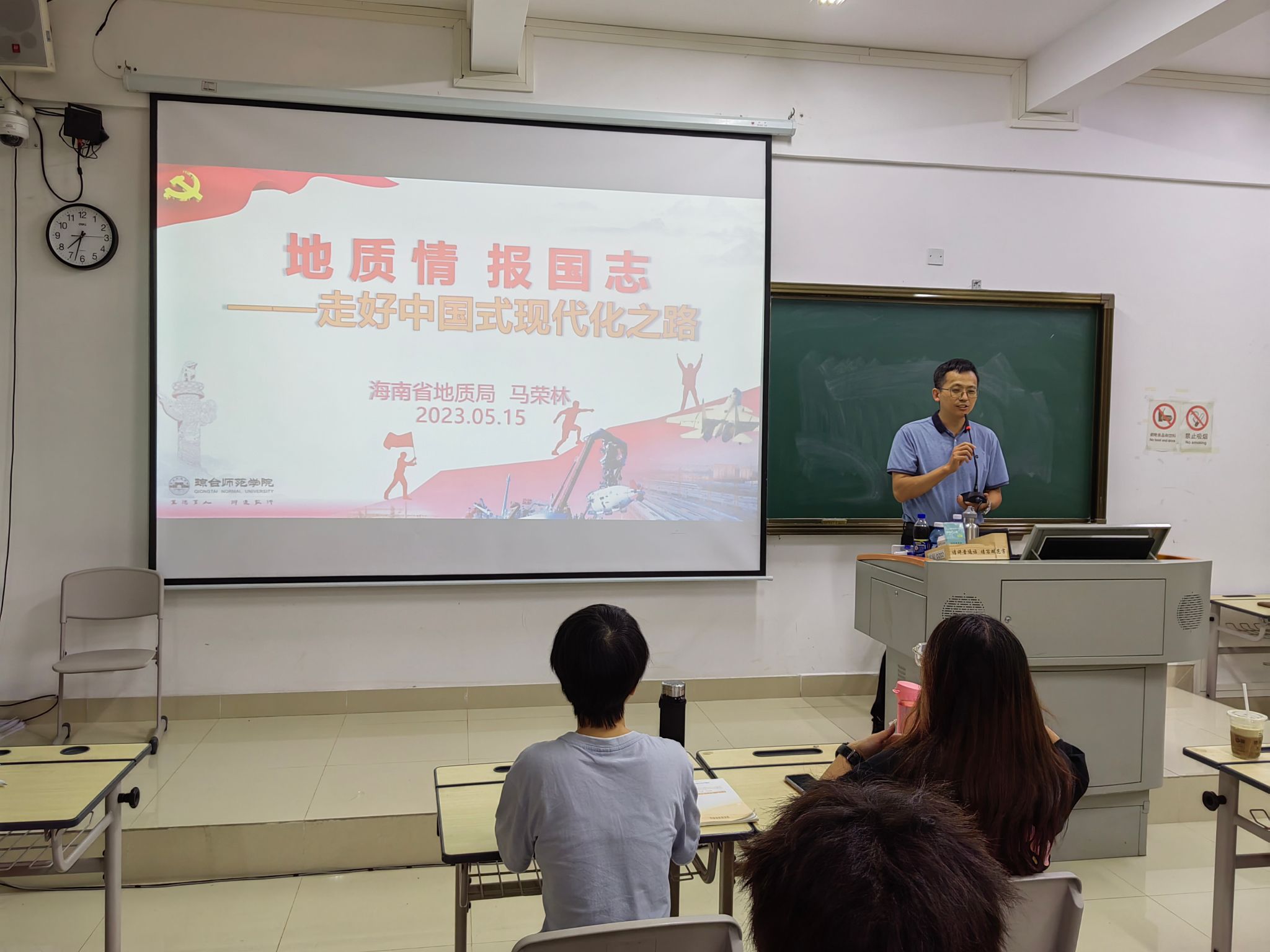 为深入开展学习贯彻习近平新时代中国特色社会主义思想主题教育,用党的创新理论统一思想、统一意志、统一行动,把习近平新时代中国特色社会主义思想转化为坚定理想,依照太阳成集团122ccvip“思想政治理论课教学质量提升年”统一部署,太阳成集团122ccvip邀请海南省地质局综合勘察设计院党支部书记马荣林于5月15日为2022级思政教育1、2班全体同学做了主题为“地质情,报国志——走好中国式现代化之路”的专题讲座。