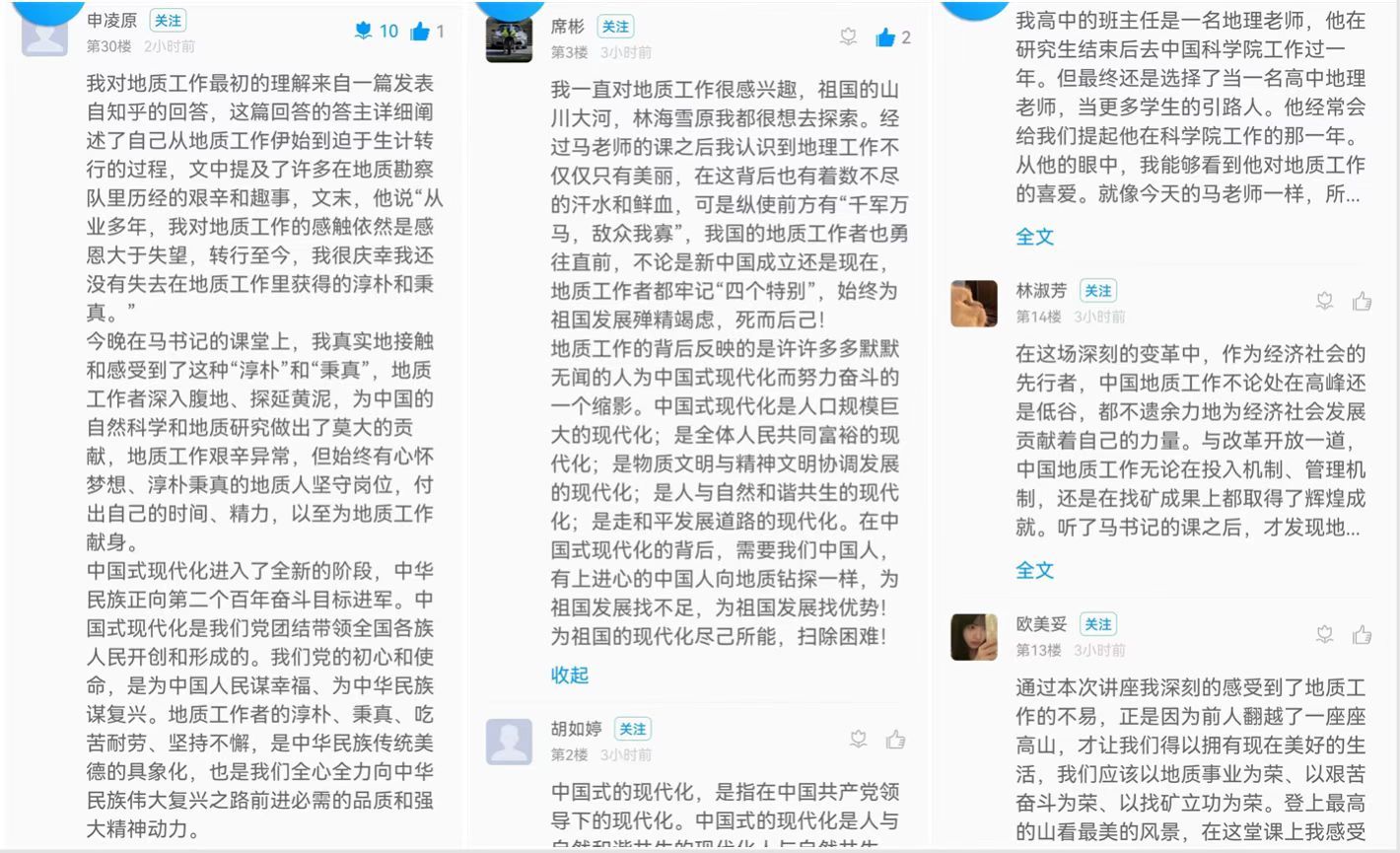 同学们在认真听取马书记精彩讲座之后,都表示祖国能有今天成就,就包含有一批又一批耐得住寂寞、吃得了苦头、受得了打击的地质人的伟大贡献,艰难困苦,玉汝于成,自己应该更加珍惜来之不易的学习机会,用实干回报国家,用成绩展示青春。