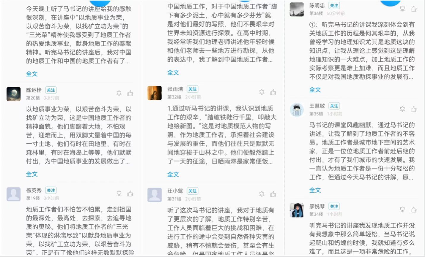 参与讲座的老师纷纷表示,没想到印象中“日炙风吹面如墨”的地质人是如此乐观幽默,更加反衬出地质人工作的艰辛,特别是从马书记的歌声中,听到了勇气、听到了泪水、听到了怀念、听到了责任、听到了地质人深深地大无畏自豪!大家都表示,相比伟大的地质工作者,自己的工作环境工作条件已经相当优越,真的应该学习广大地质工作者在逆境中矢志奋斗、以实干铸就事业的精神,努力把思政课讲得更有亲和力和感染力、更有针对性和实效性,实现知、情、意、行的统一,让学生口服心服。