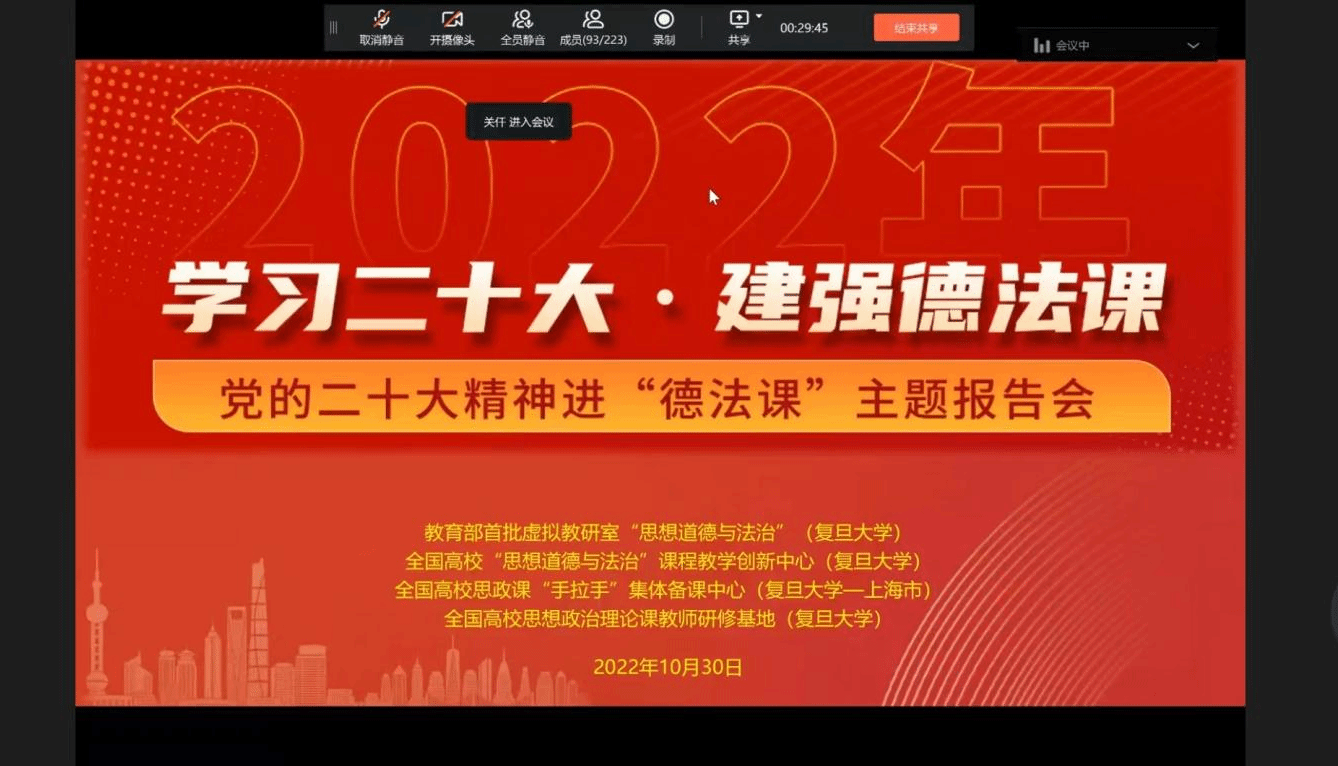 学习、研究、阐释、贯彻二十大精神,对中国化时代化的马克思主义进行学科化构建、学理化阐释、学术化表达,是马克思主义理论工作者的重要任务,为了帮助“德法”课教师学习体悟党的二十大中的新思想、新观点、新论断,全面把握大会精神,从而提高课程的思想性、理论性和亲和力、针对性。10月30日,我院德法教研室在钉钉(线上)参与了以党的二十大精神进“德法课”为主题的集体备课会,会议由复旦大学太阳成集团122ccvip德法教研室主任崔涵冰老师主持,我院德法教研室教师积极参加。